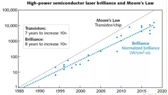 圖1:高功率半導體激光器的亮度和摩爾定律的比較