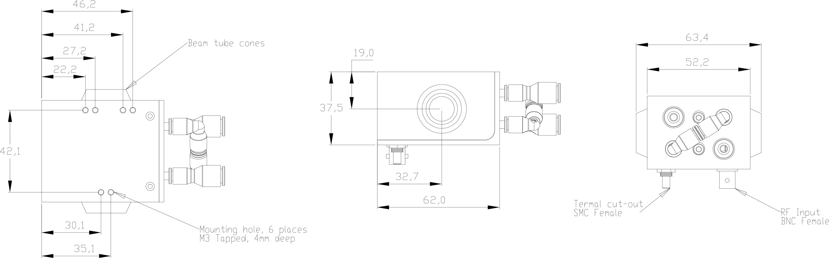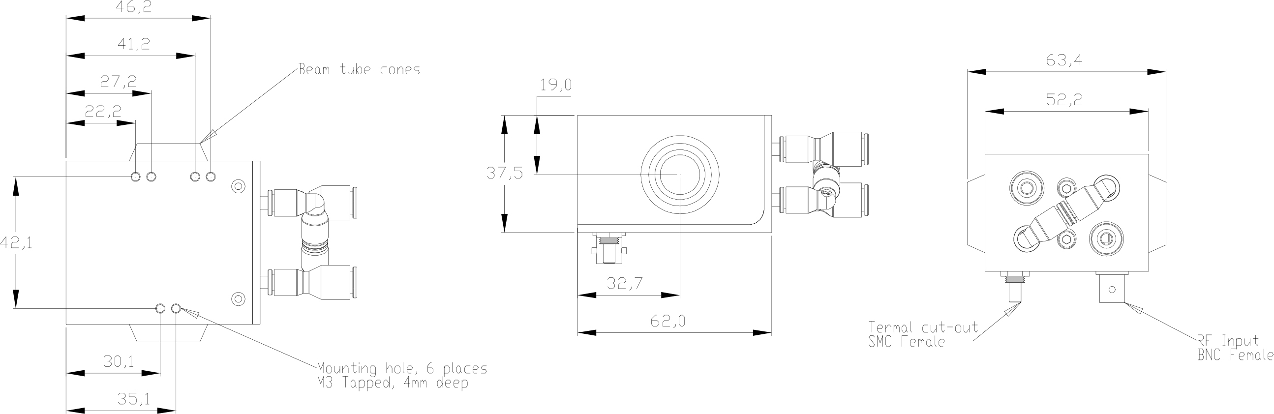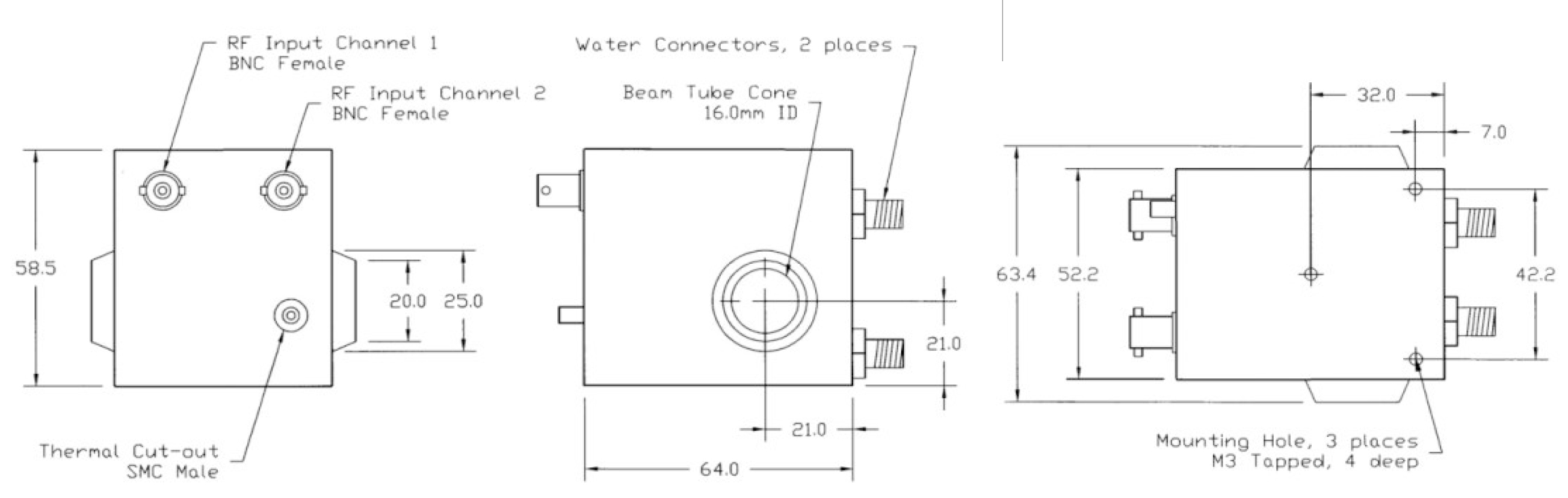 例如:I-QS027-4S4G-B5-AT1(Q開關,27.12MHz,4mm有效孔徑,S模式,熔融石英,1064nm,帶B型水接頭,帶M3安裝孔的標準外殼)注:如所示,–AT1表示M3安裝孔,對于英制6-32UNC安裝孔,不需要編號。40.68和68MHz選項僅適用于50W射頻驅動功率,40.68和68MHz選項僅適用于最大5.0mm的有效孔徑。